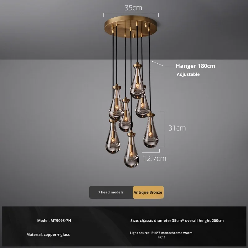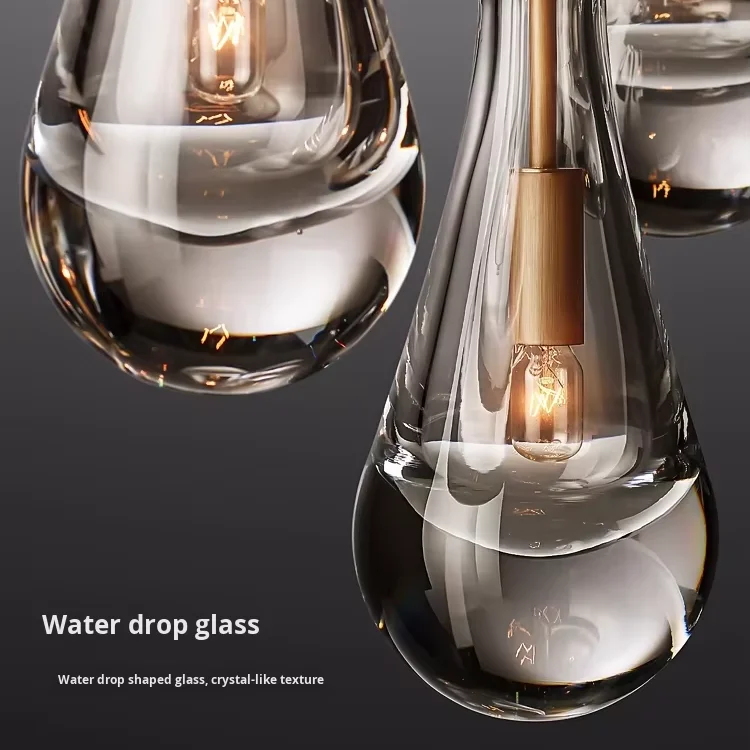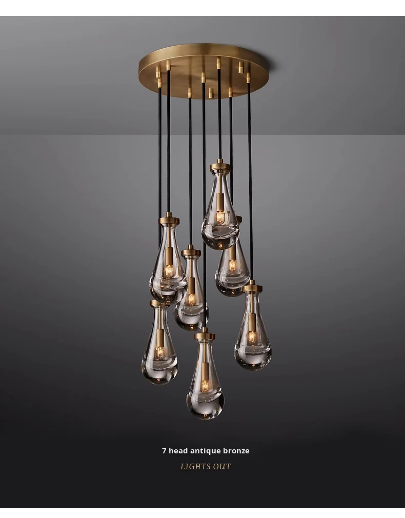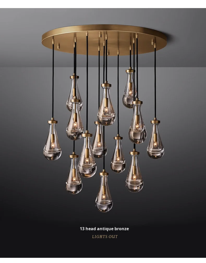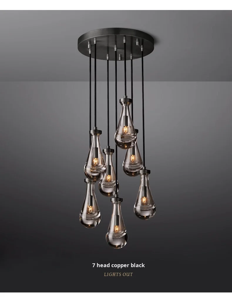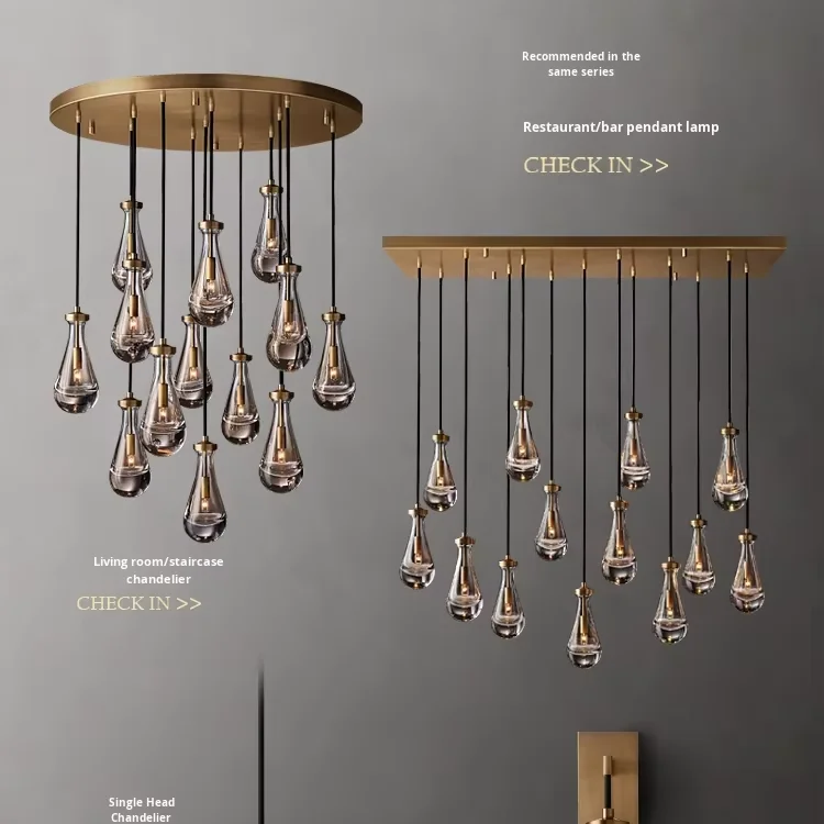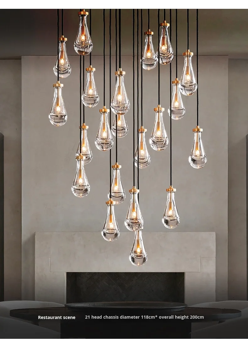 Araña grande de cobre {Gota de agua} para sala, dormitorio, escalera al aire libre, villa dúplex, lámpara de tamaño medio de material de hierro