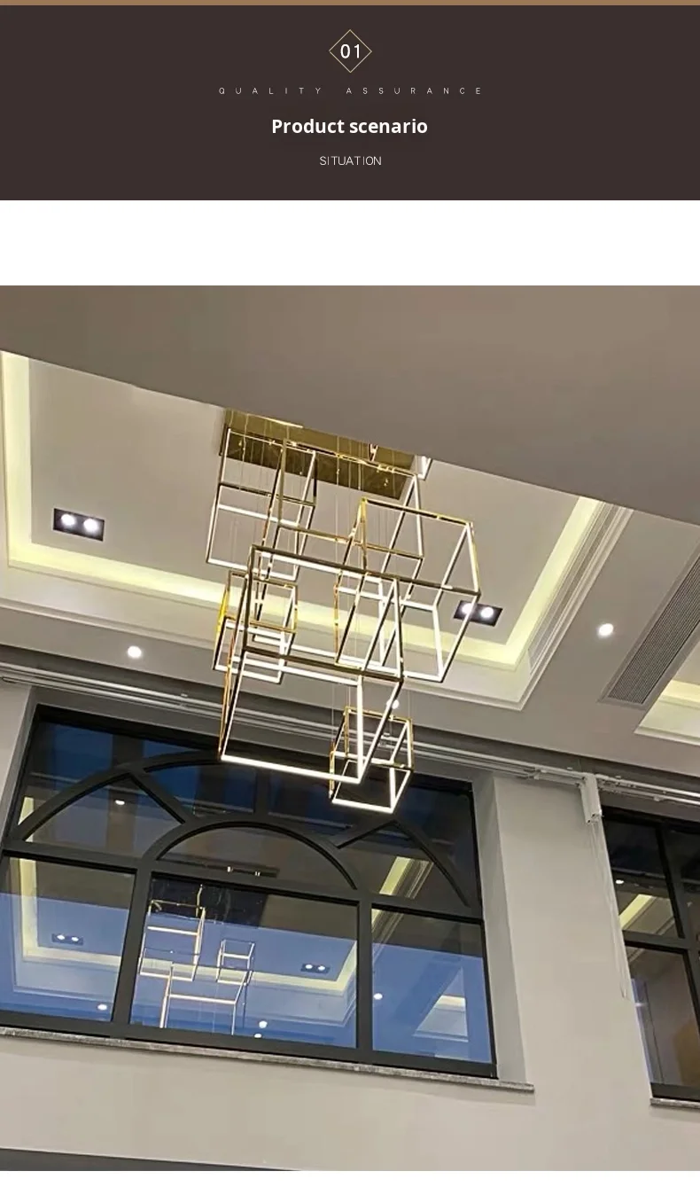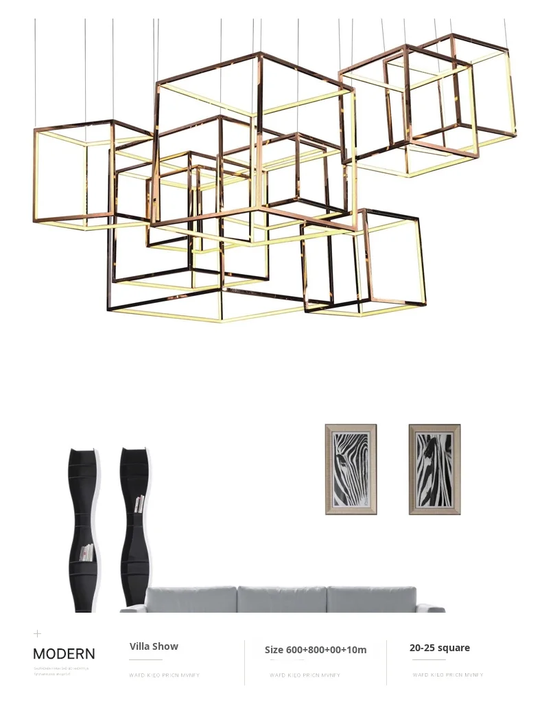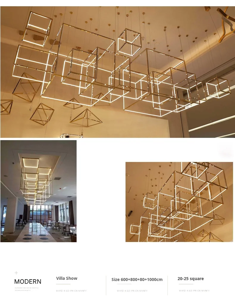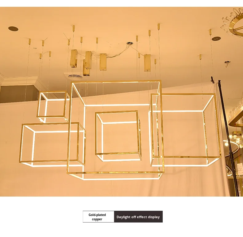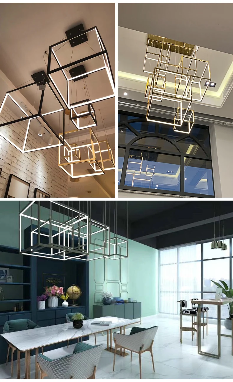 Lámpara colgante cuadrada creativa posmoderna minimalista de acero inoxidable para techos altos, luz de lujo para comedor, sala de estar y salas de exposición