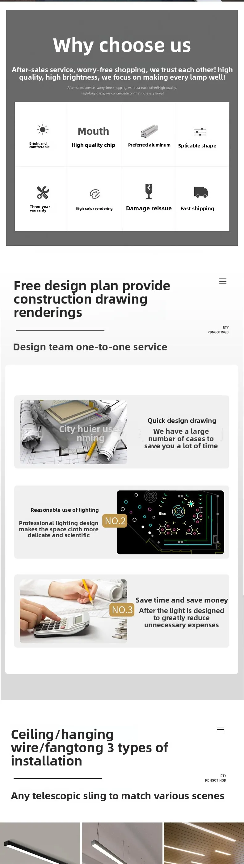در باره خدمات، ما پر از صمیمیت هستیم. ما طرحهای طراحی نورپردازی رایگان ارائه میدهیم و کارکنان حرفهای بر اساس ویژگیهای فضای شما و نیازهای شخصی شما، اندازهگیریهای میدانی انجام میدهند تا راهحلهای نورپردازی اختصاصی سفارشی ارائه دهند. از ارتباط درباره طرح، تولید محصول تا نصب و آزمایش، کارکنان اختصاصی ما دنبال کار میکنند تا خدمات توجهآمیز و فکرمندی تضمین کنند.