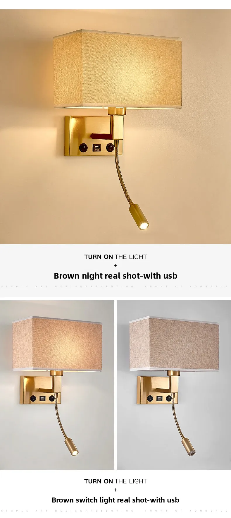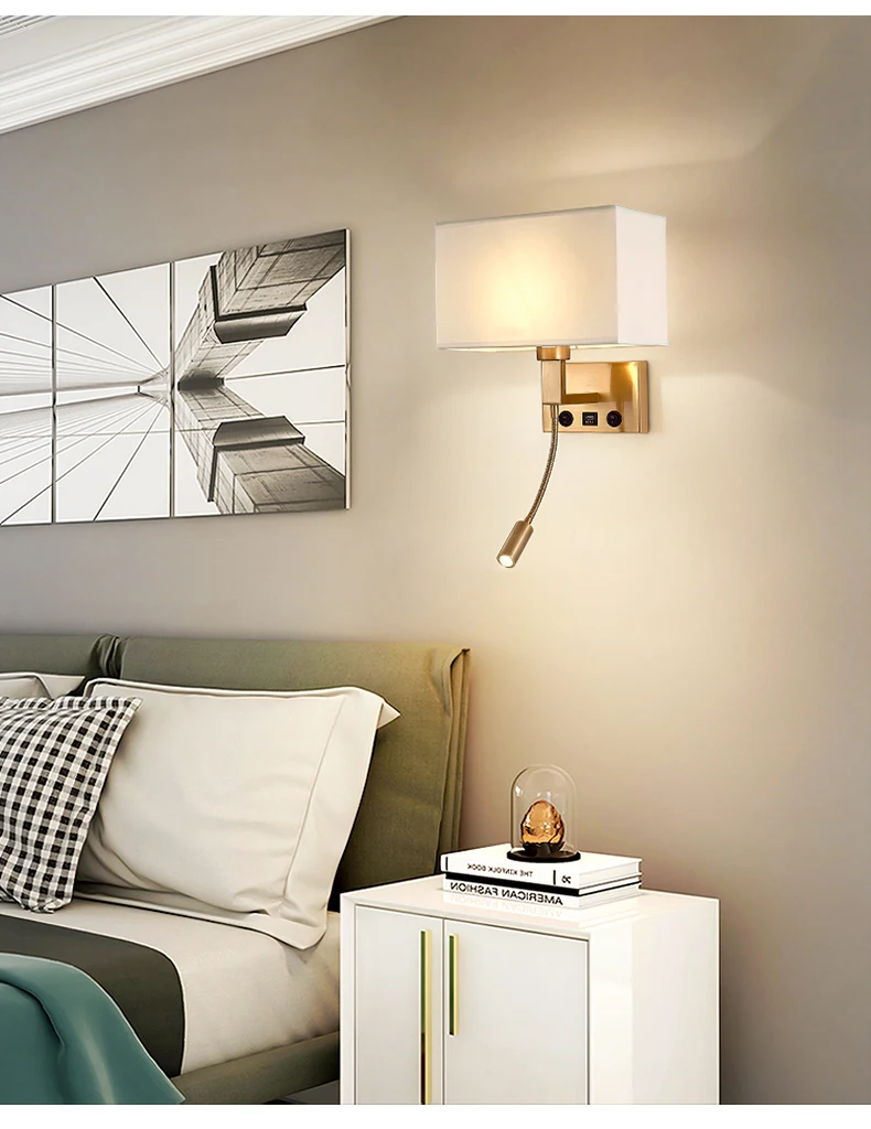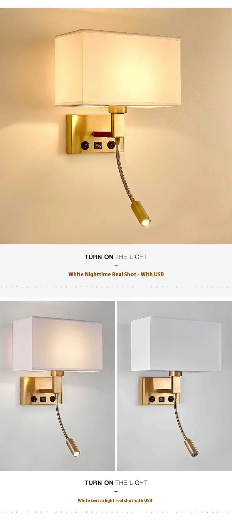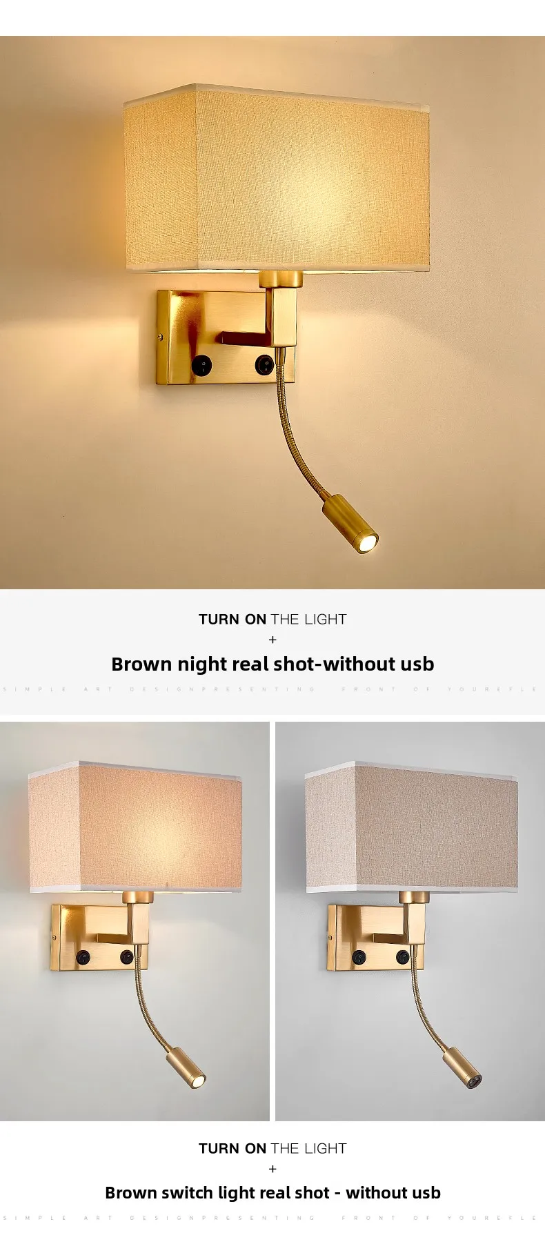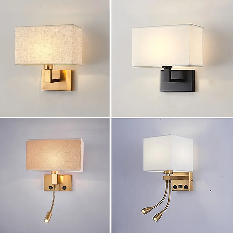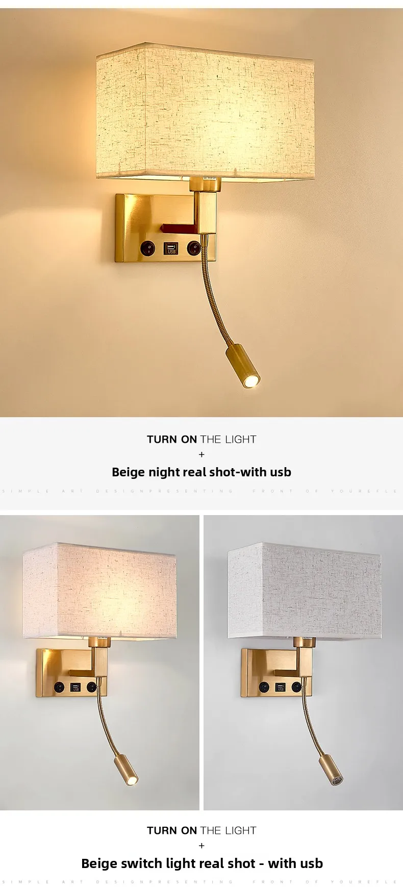 Lampe murale noire câblée avec abat-jour en tissu Port USB et lampe de lecture LED Corps en fer Lampes murales de chambre à coucher Prise murale Commutateurs inclus