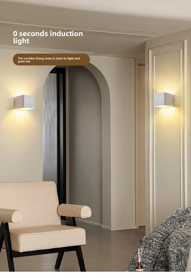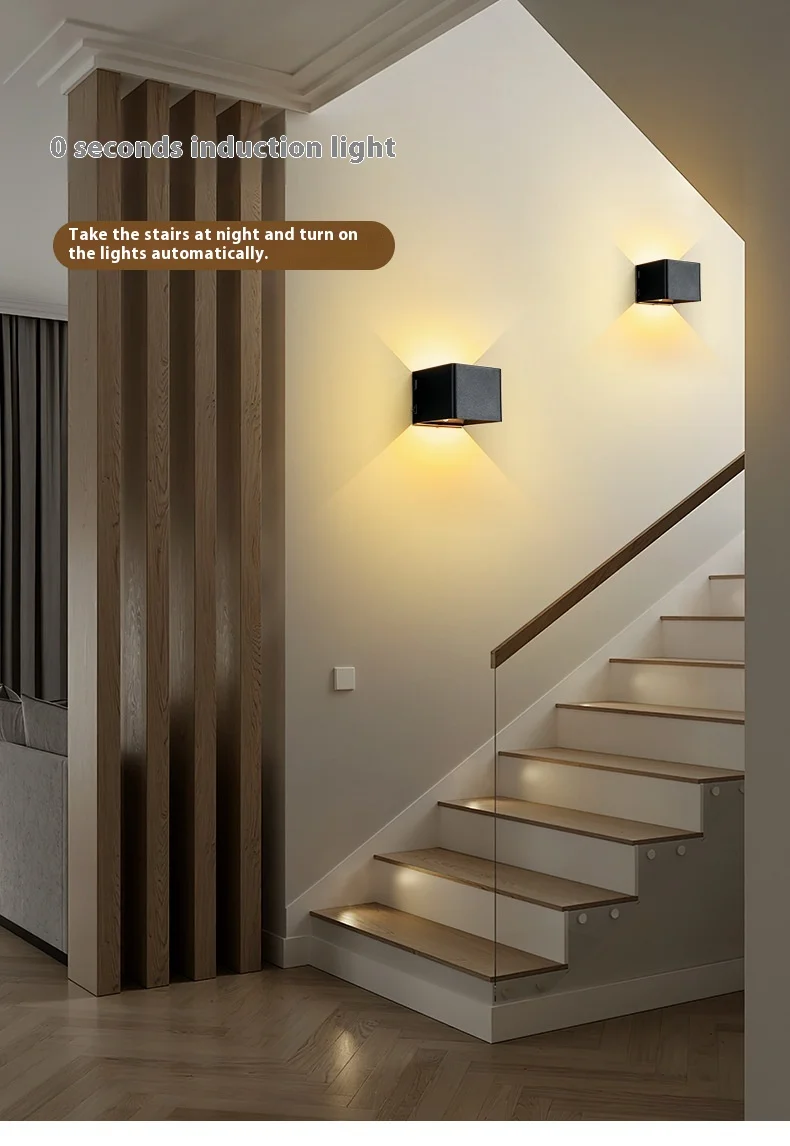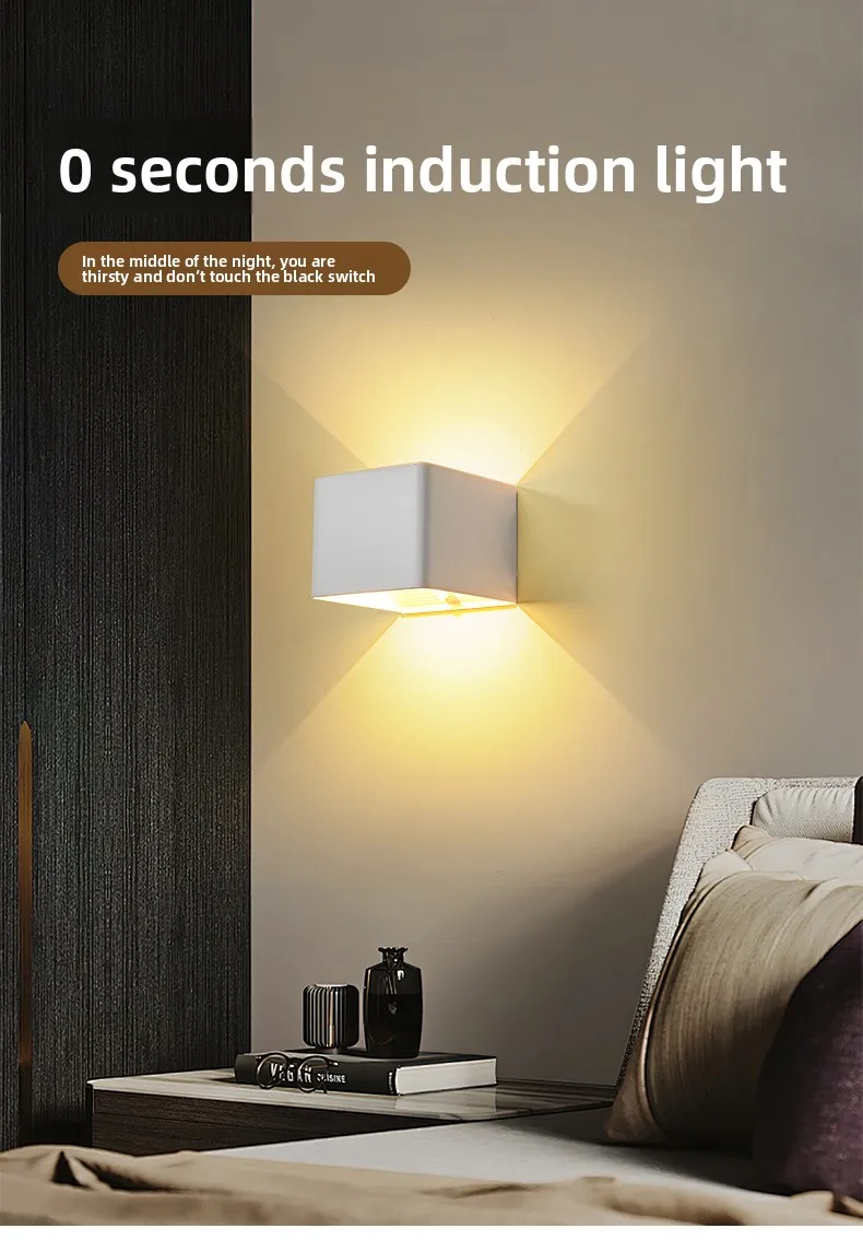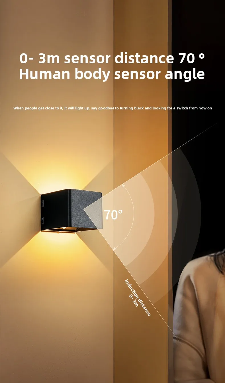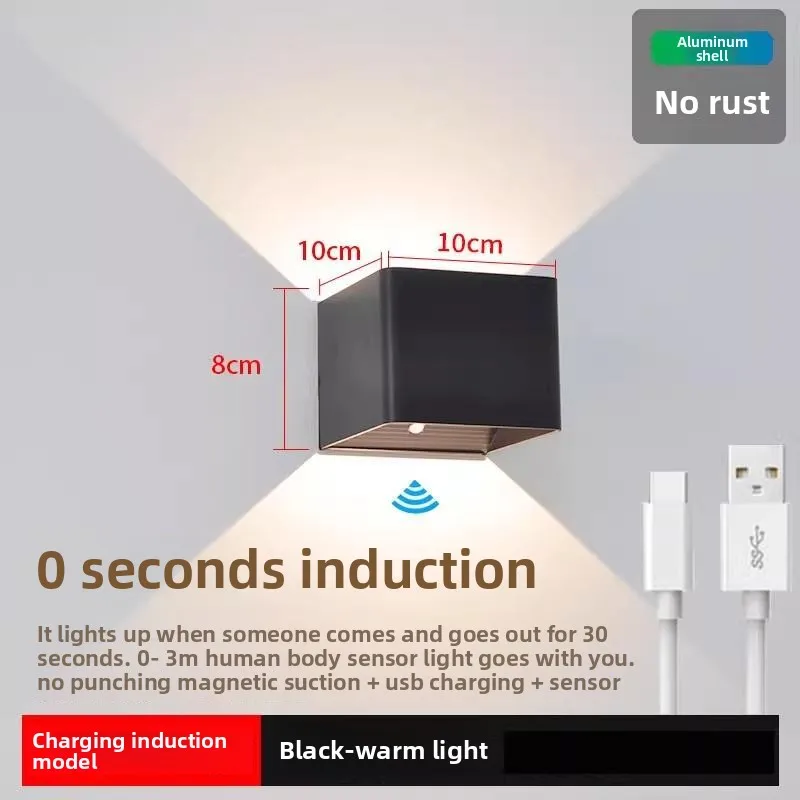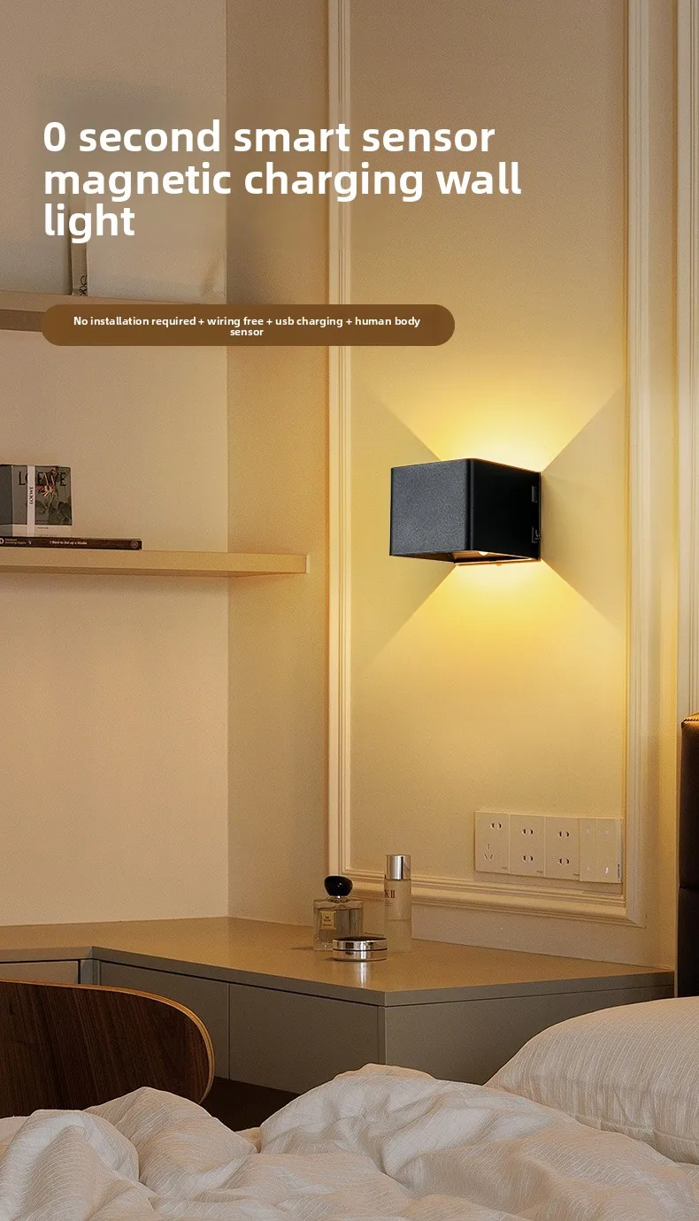 luce a muro LED con caricamento USB 5W in alluminio nero per camera da letto, lampada a muro ricaricabile con sensore di movimento wireless