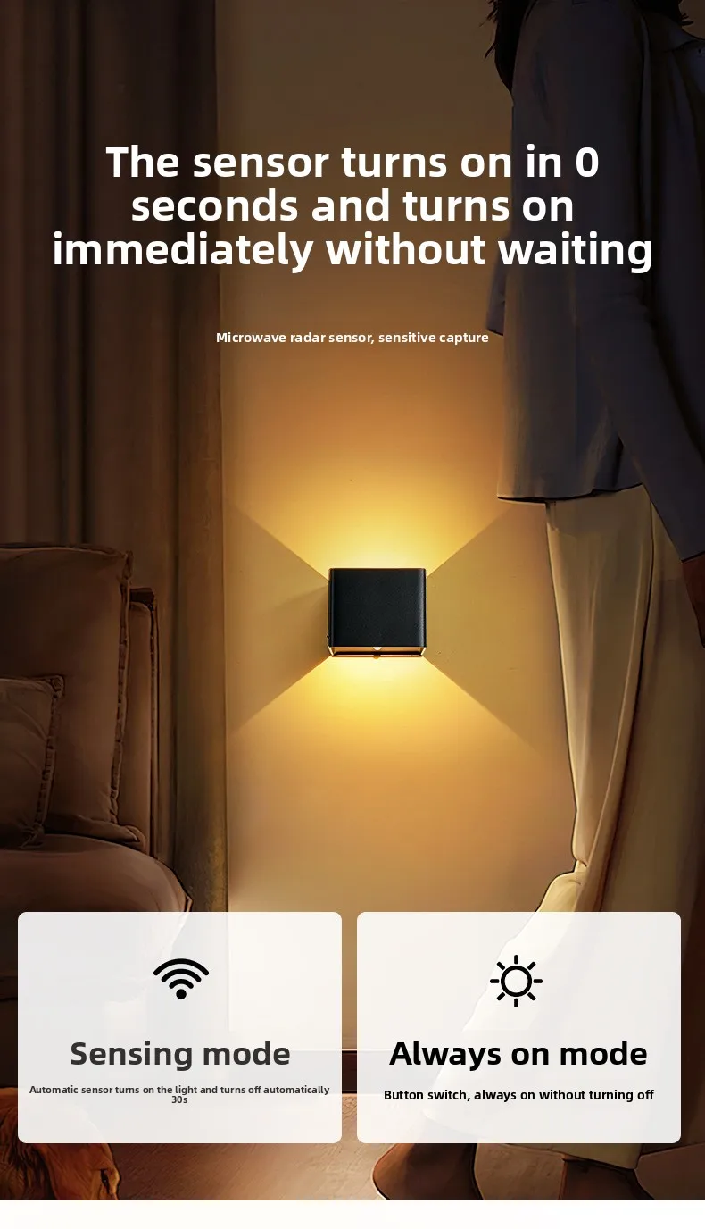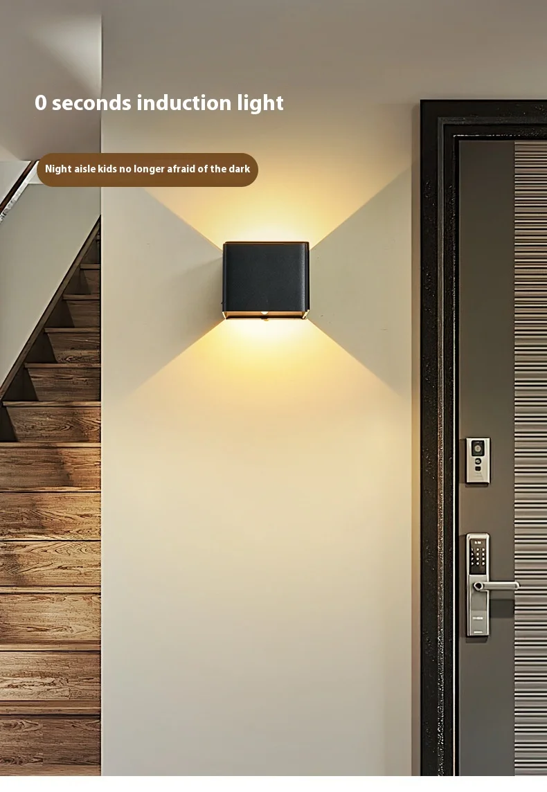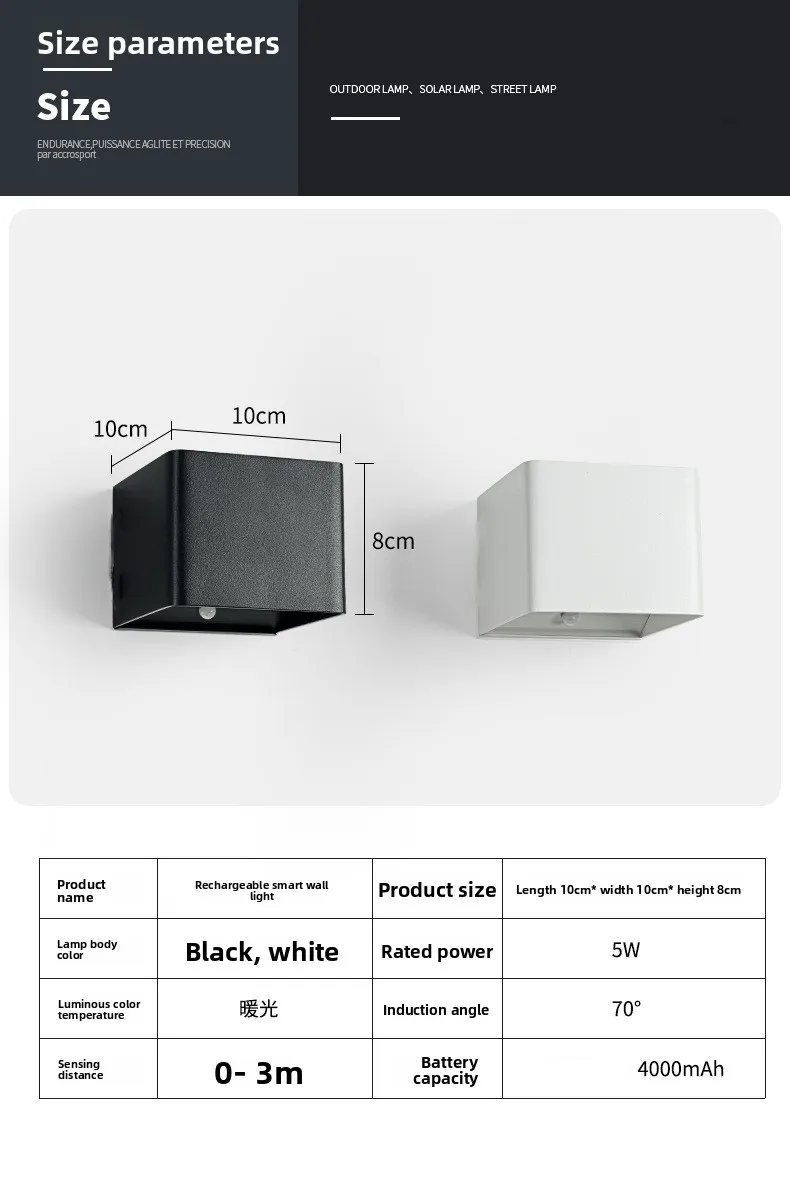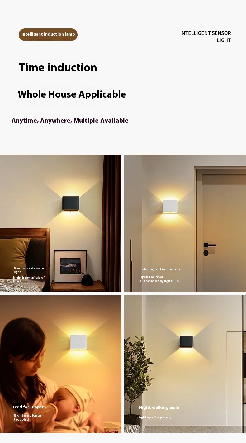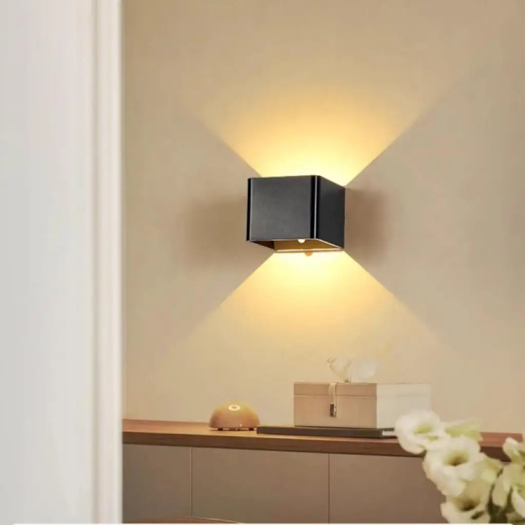 luce a muro LED con caricamento USB 5W in alluminio nero per camera da letto, lampada a muro ricaricabile con sensore di movimento wireless