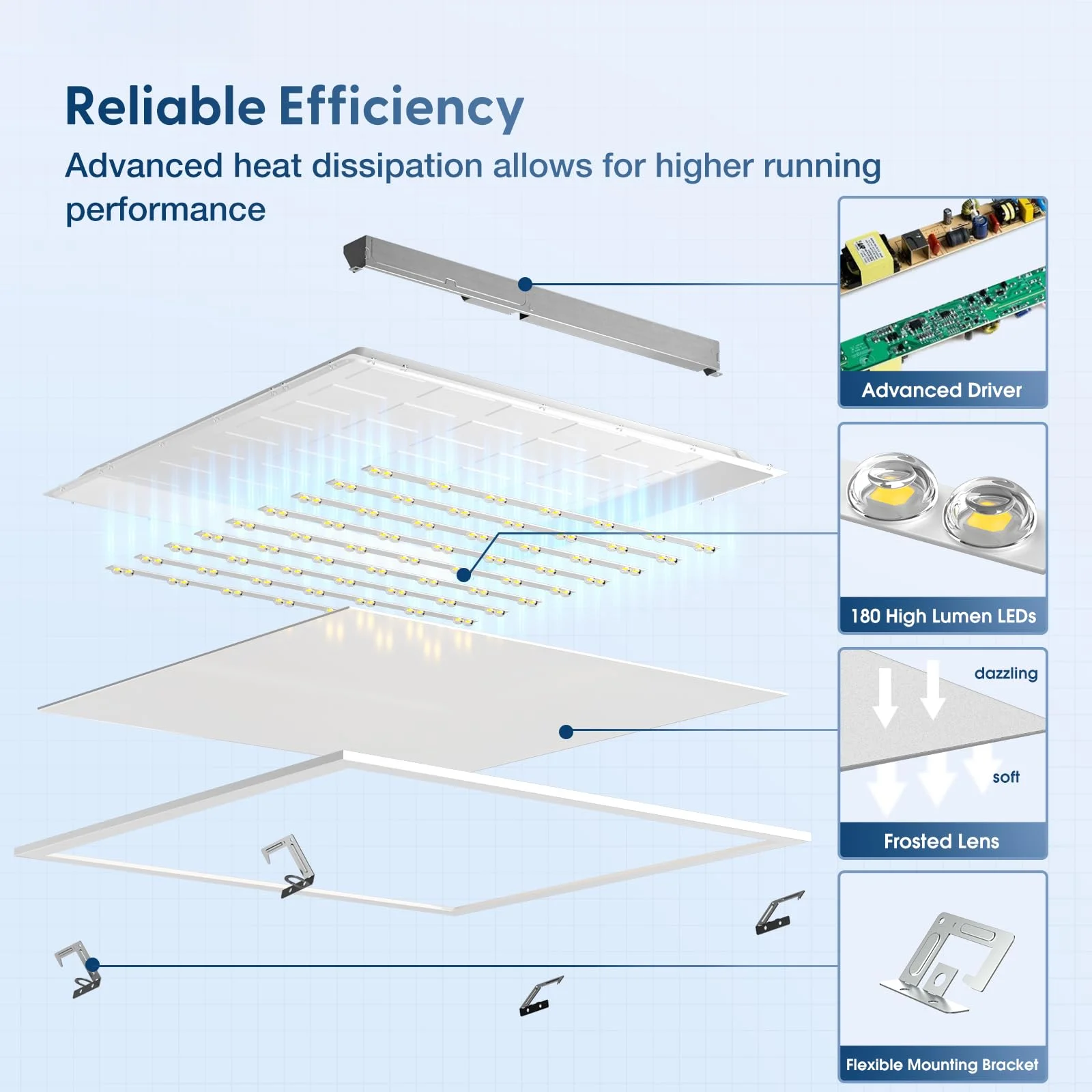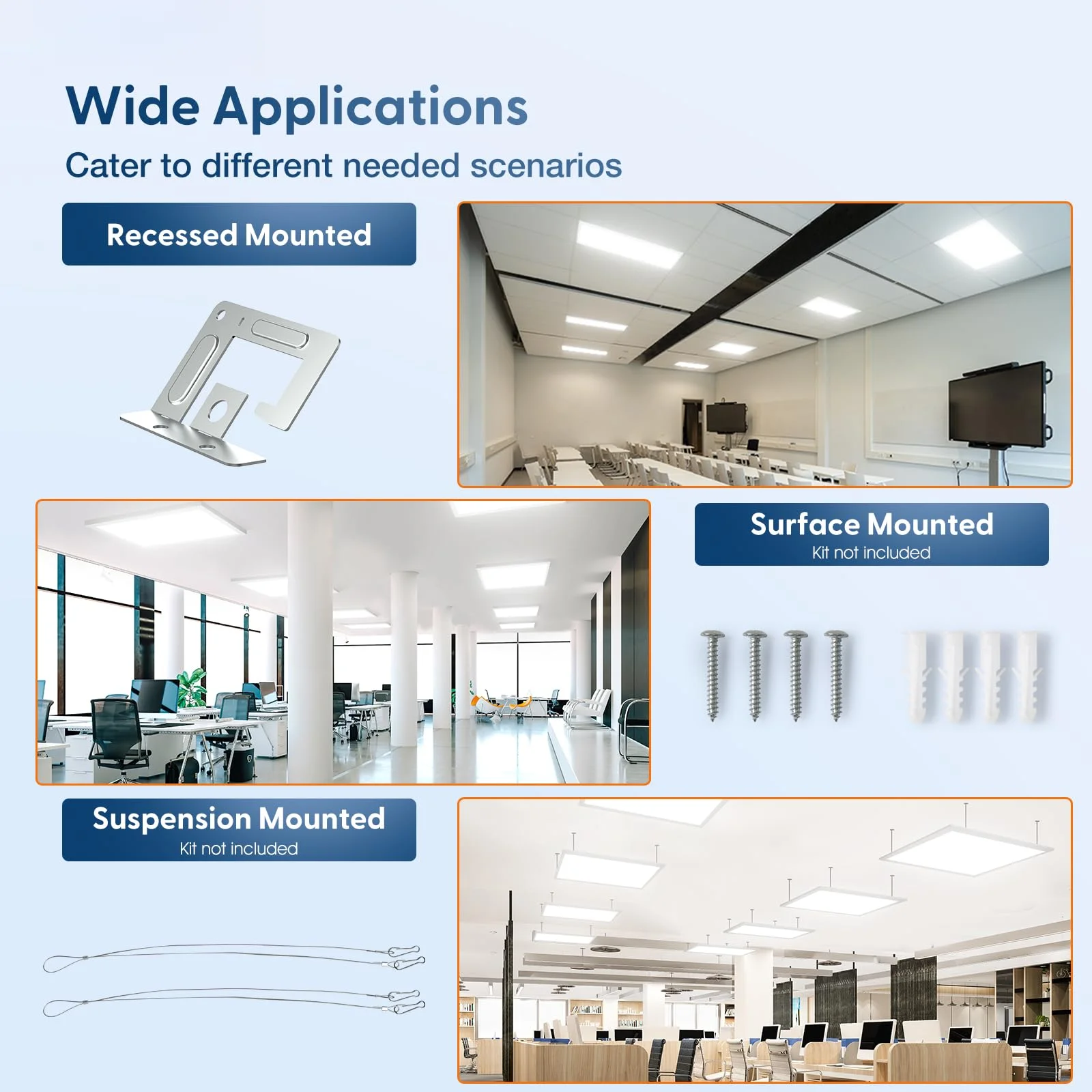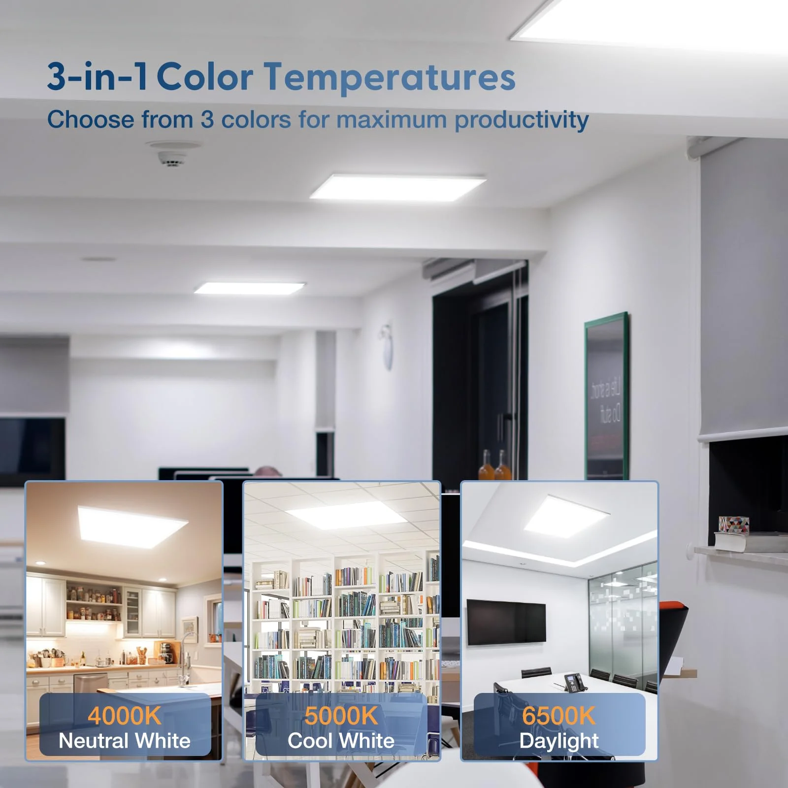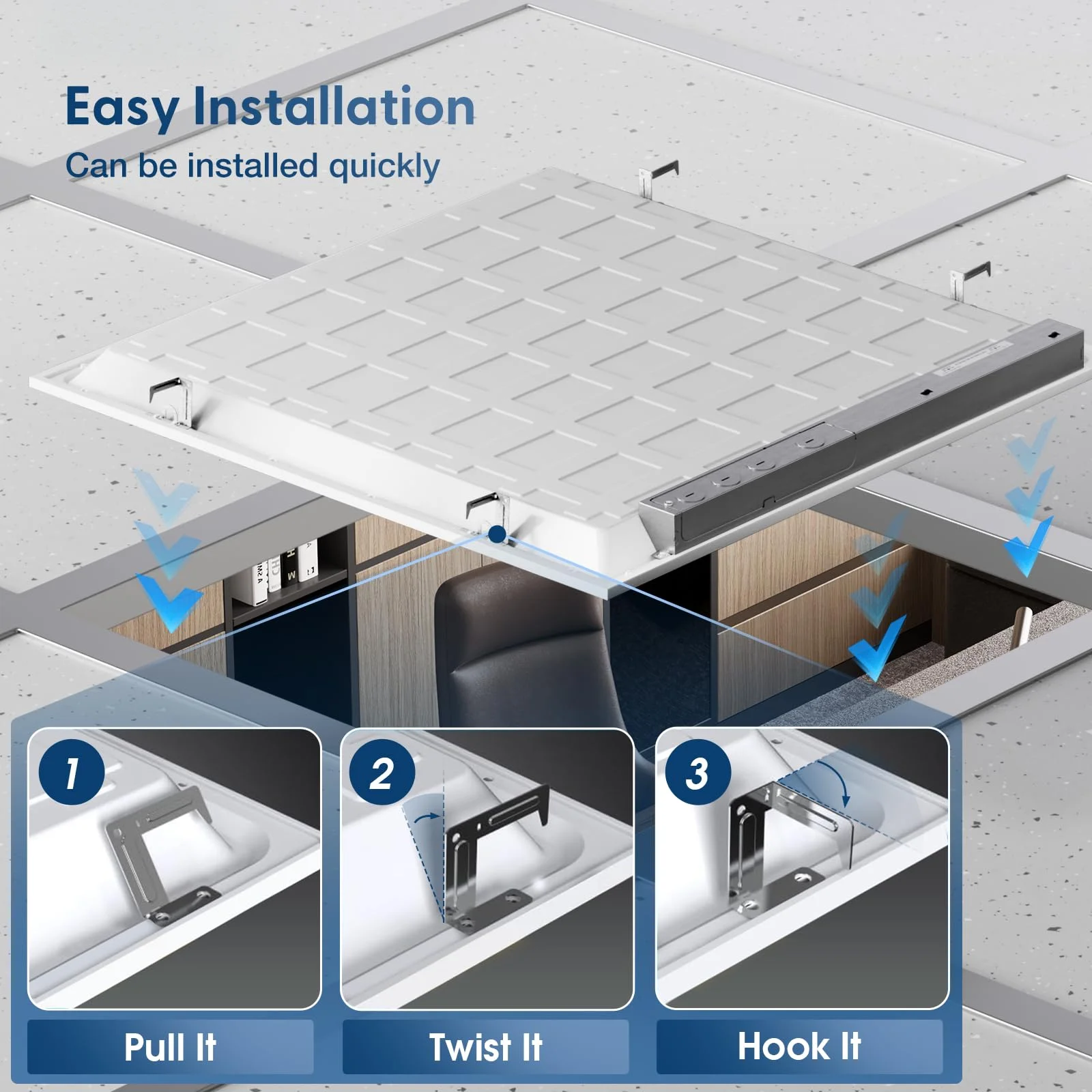 1. La luce a pannello LED 2x2 ft offre un'elevata luminosità con un flusso luminoso di 4400-4800LM, risultando ideale per ampi spazi aperti come uffici e scuole. La tecnologia LED garantisce efficienza energetica e una durata fino a 50.000 ore.