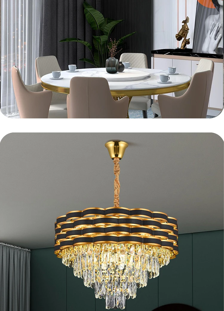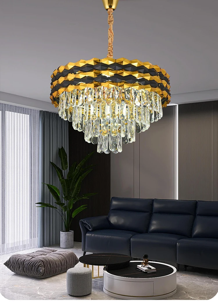 European-Style Luxurious Black Gold Crystal Ceiling-Mounted Decorative Light Pendant Chandelier Adjustable Height for Living