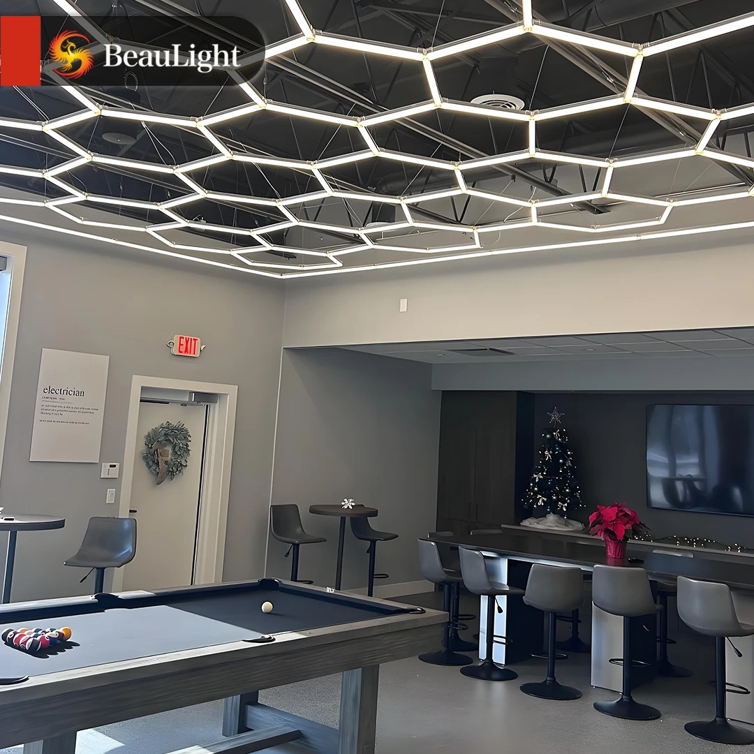 1.LED Hexagon Ceiling Light for exceptional car showroom, auto workshop, and barber shop illumination.